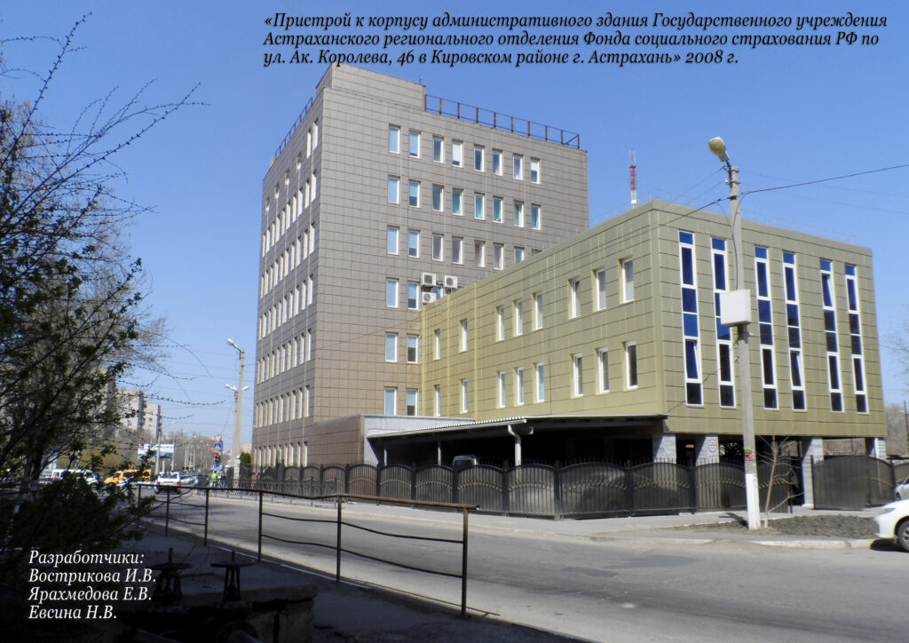 Проект пристроя к корпусу административного здания Государственного учреждения Астраханского регионального отделения Фонда социального страхования РФ по ул. Ак. Королева, 46 в Ленинском районе г. Астрахани